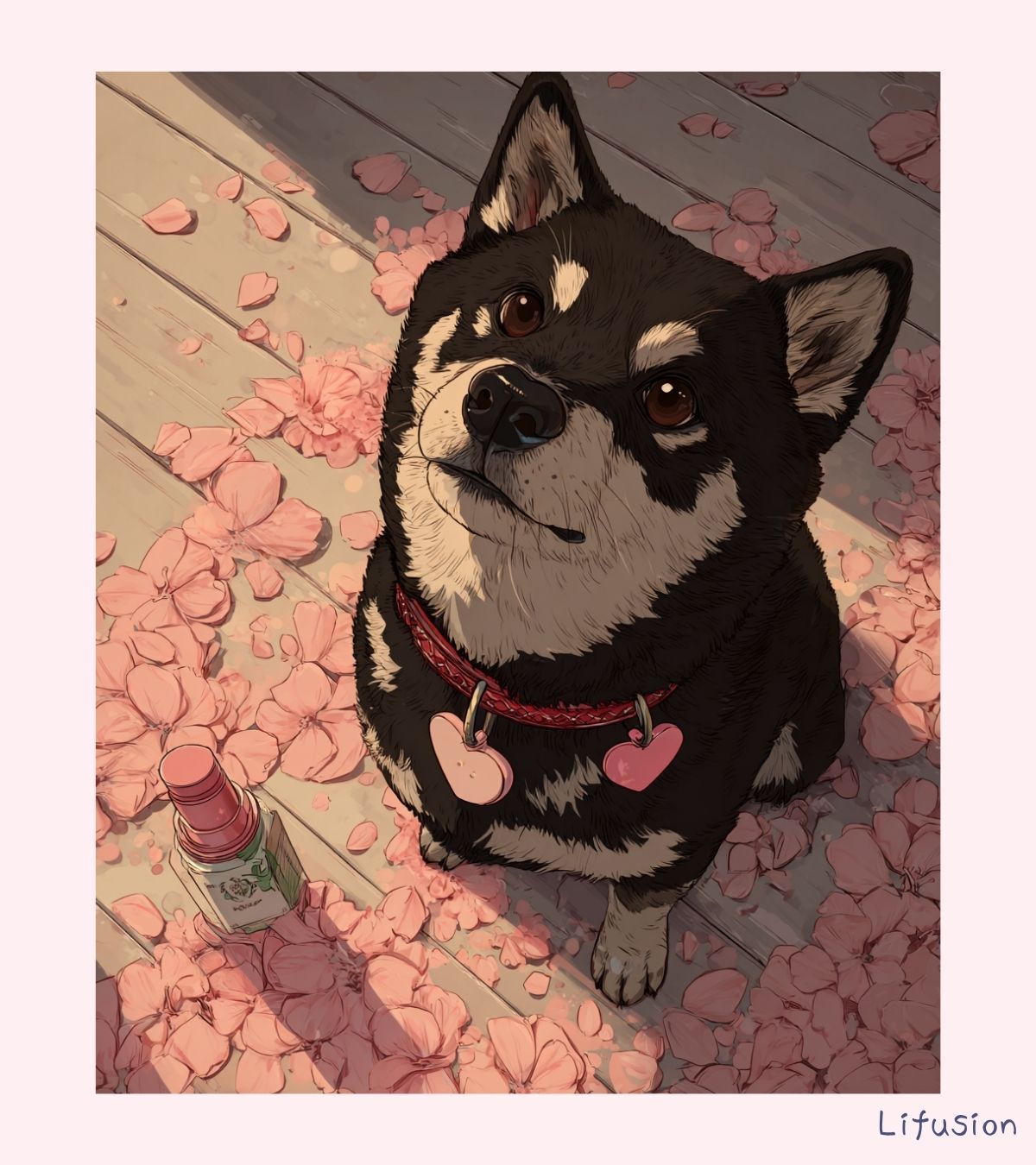 足元にリップが1本転がっていて、それに気づいているのかいないのか、こちらを見上げている表情がなんとも余裕のある顔です。赤い首輪にピンクのハートタグが2つぶら下がっていて、桜の花びらの色とリンクしています。黒い毛色と薄桜の背景のコントラストがはっきりしていて、シンプルな配色なのに目を引きます。