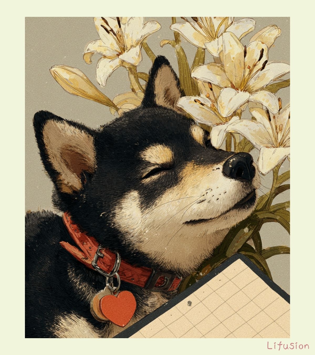 手前には方眼ノートの角がちらっと見えていて、仕事の合間にお花見しているような雰囲気です。黒い毛色と白い百合の花のコントラストがきれいで、クリーム色の背景によくまとまっています。