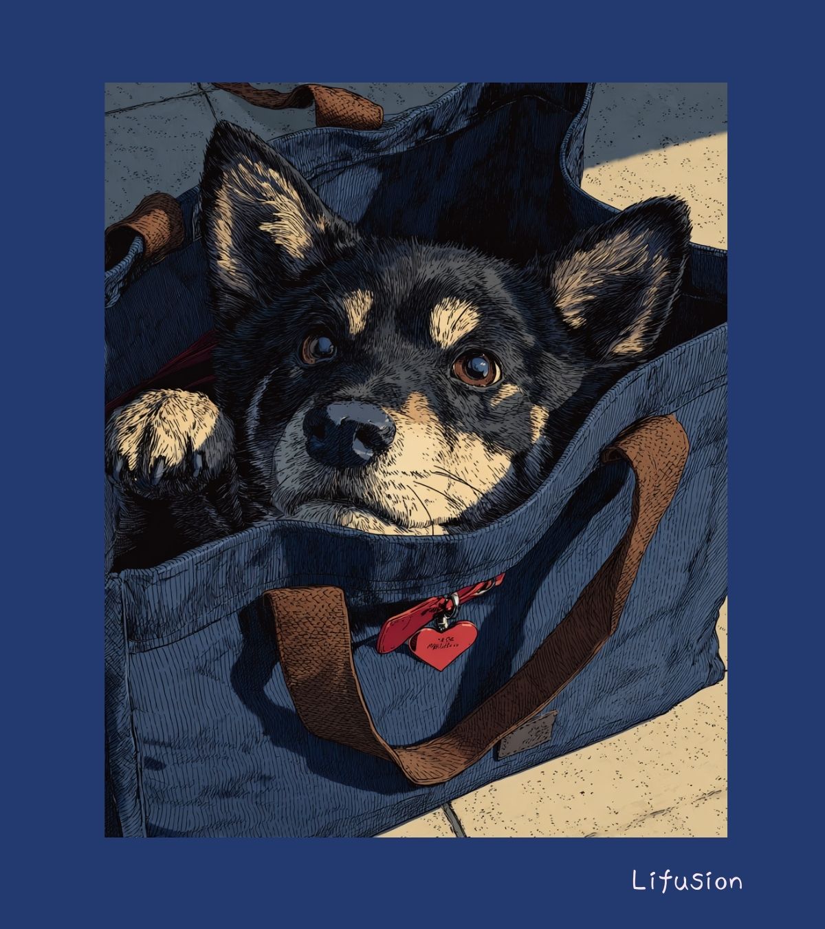 「ねえ、出かけないの?」と言わんばかりに、バッグの中にすっぽりと収まってしまいました。この期待に満ちた瞳で見つめられたら、断れませんよね。ちょこんと出した前足と、赤いハートのチャームが、紺色のキャンバスによく映えています。