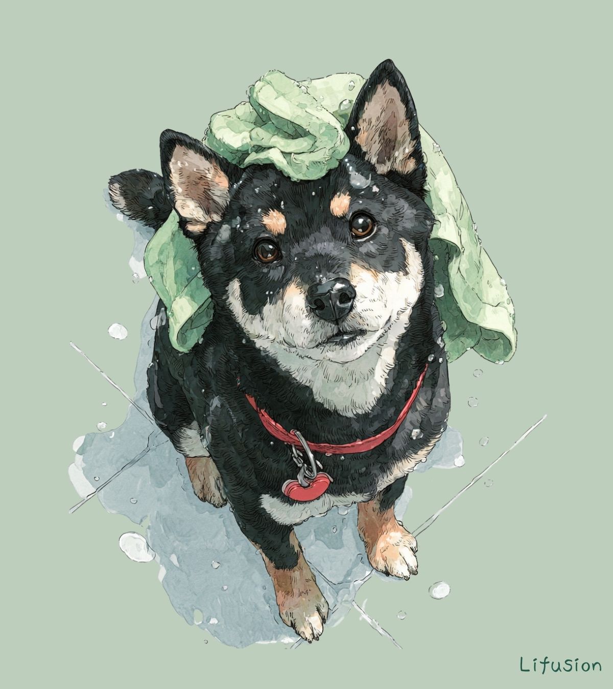 今日の相棒、黒柴ちゃんは頭にふきんを乗せられて、なんだか誇らしげな表情。お風呂上がりなのか、それともお手伝いのつもりなのか、きゅるんとした瞳で見つめてくる姿に思わず頬が緩んでしまいます。この愛らしい動き、たまりませんよね。