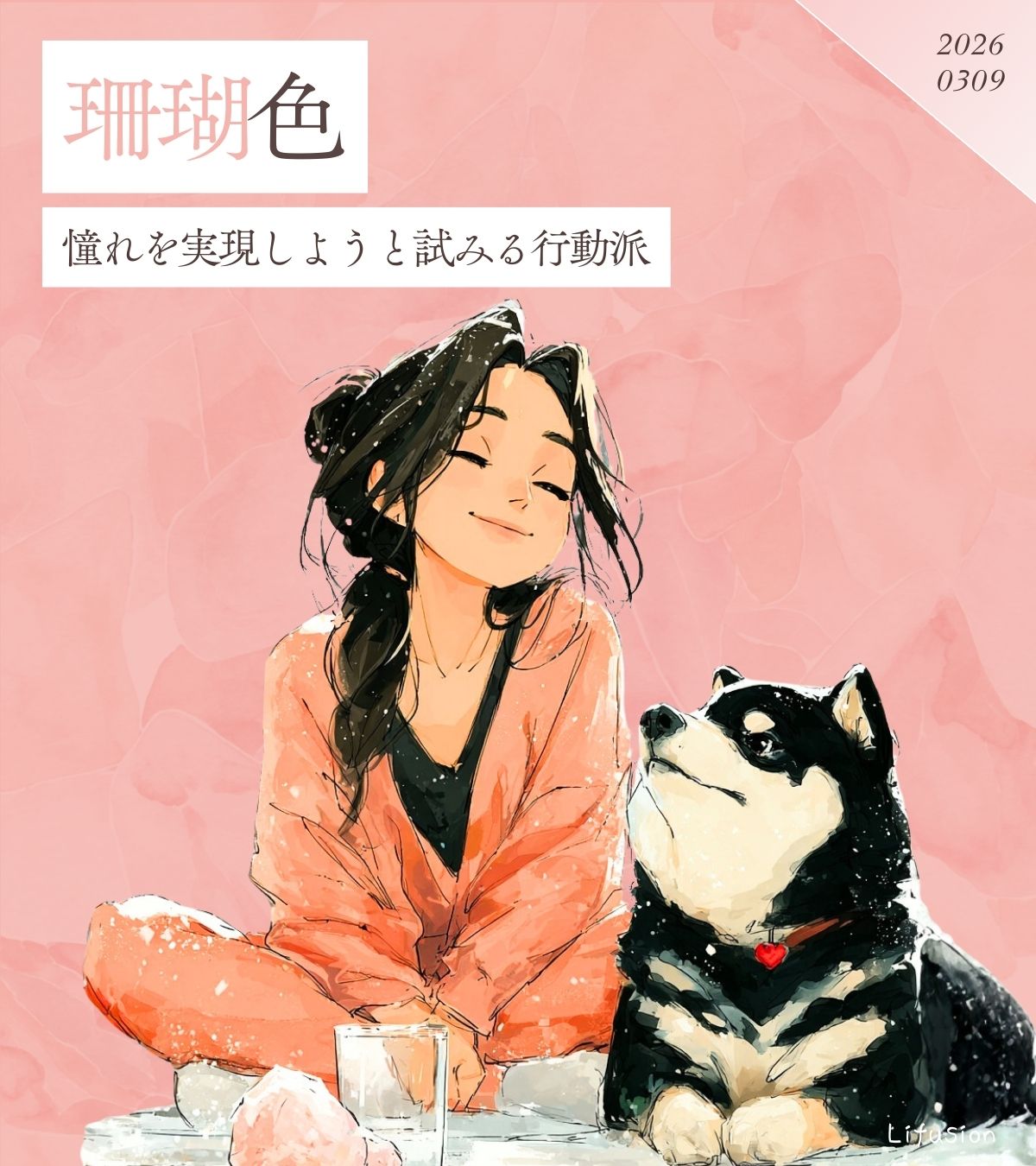 珊瑚色(さんごいろ)は、海の中でゆっくりと育つ珊瑚のような、温かみのあるピンクオレンジ。色言葉は「意欲旺盛」「勇猛果敢」ですが、決して無理やり背中を押すような強さではありません。