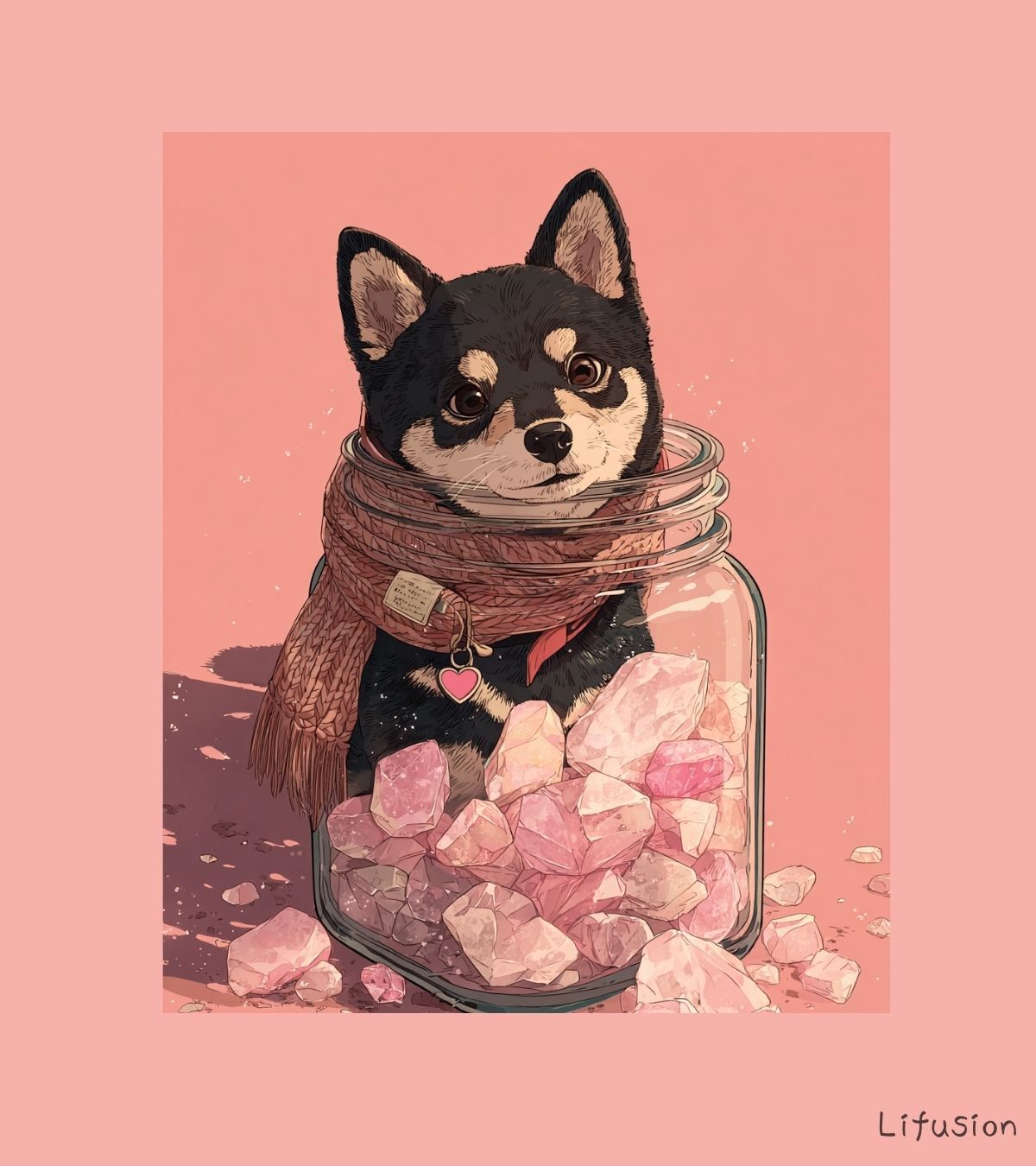 ピンクの天然石がたっぷり入ったガラス瓶にすっぽり。自分の特等席を見つけたみたいですね。