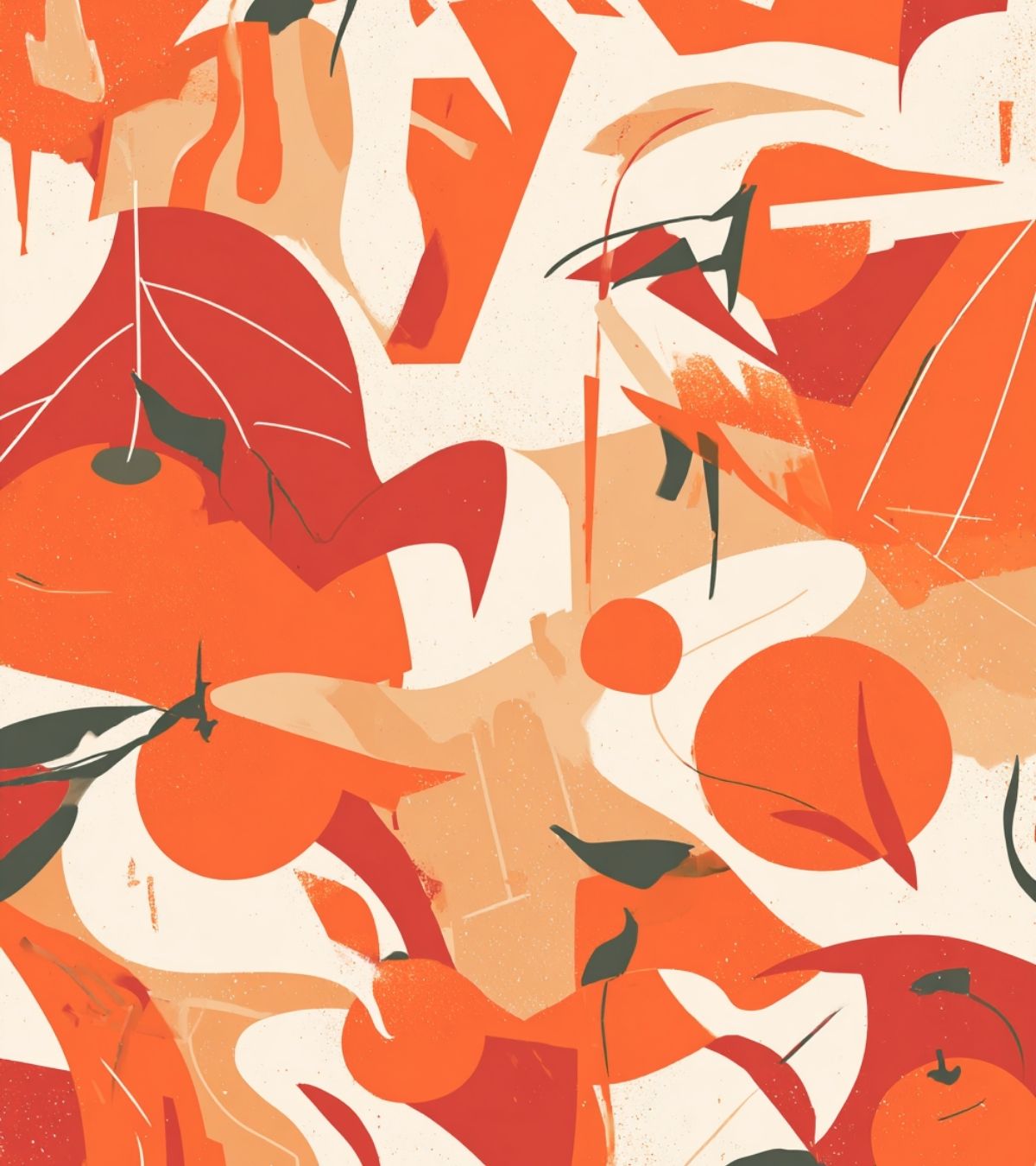 柿色のグラデーションをフラットデザイン風に仕上げた抽象イラストです。柿の実と葉っぱのモチーフを大胆に散りばめています。PCやスマホの壁紙としてお使いいただけます。