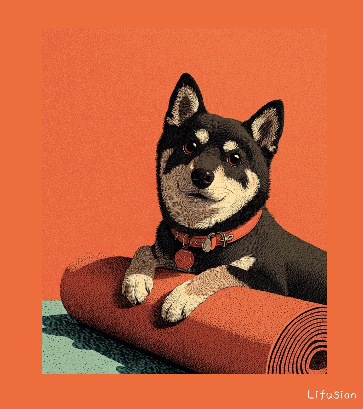 赤い首輪にメダル型のチャーム。足元にはミントグリーンのヨガマットも敷いてあって、なんかストレッチ教室の先生みたいになってる。点描風のテクスチャで毛並みがしっかり描かれてるから、もふもふ感が伝わってきます。柿色の背景に黒い毛並みがよく映えてます。