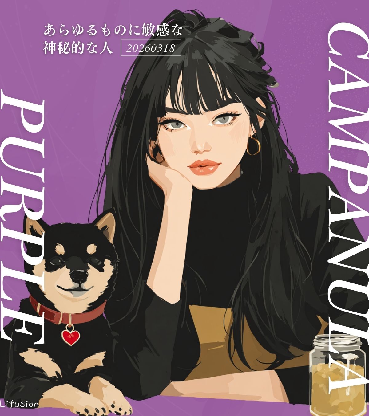 カンパヌラパープル×黒柴のAIイラスト