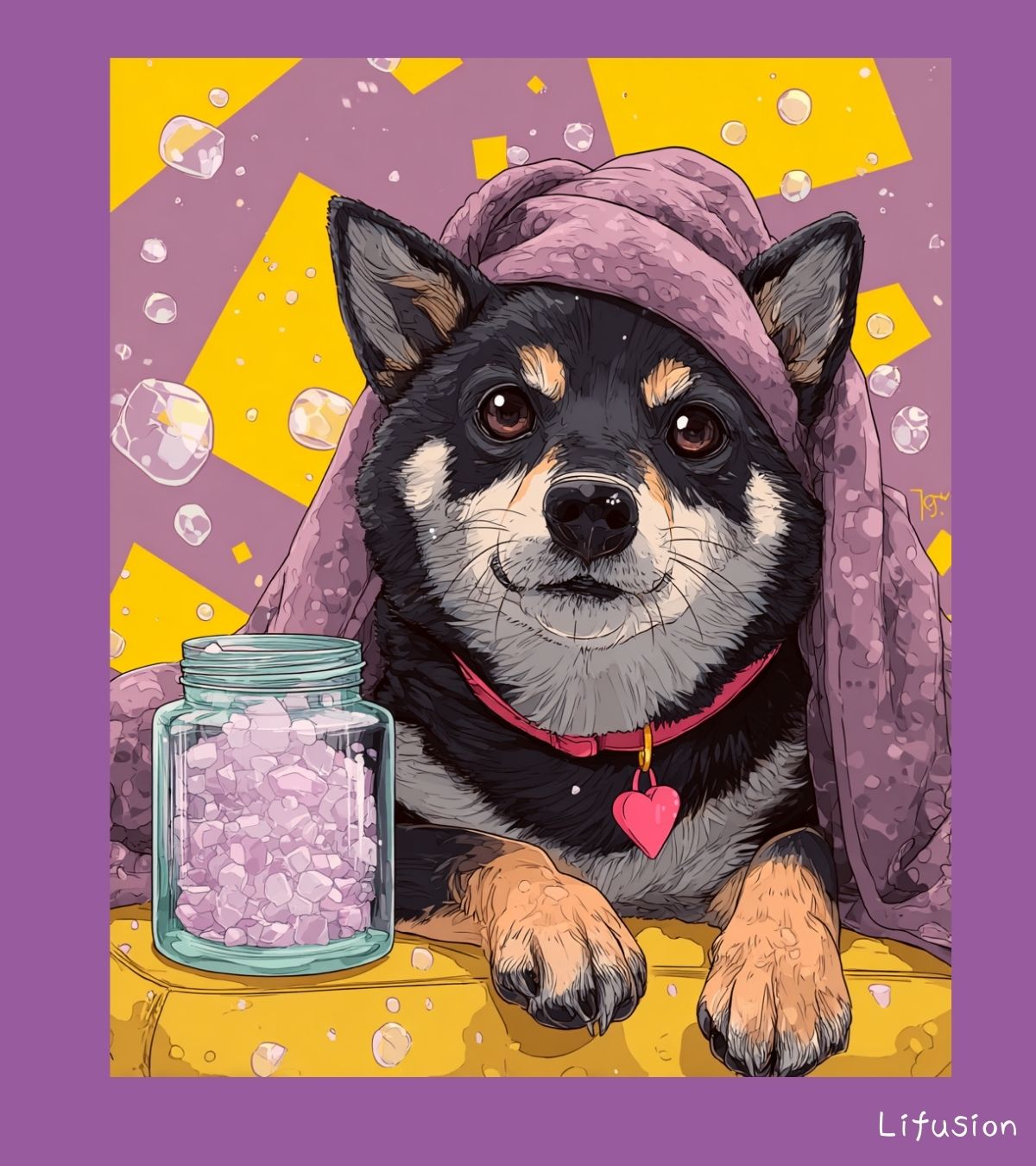 手前にラベンダー色のバスソルトが入ったガラス瓶。黄色いクッションの上で前足をちょこんと出してくつろいでる感じが完全にお風呂待ち。紫と黄色の組み合わせは補色に近いから、お互いの色がはっきり見える。ポップアート調の線画でコントラストが強めに出てます。