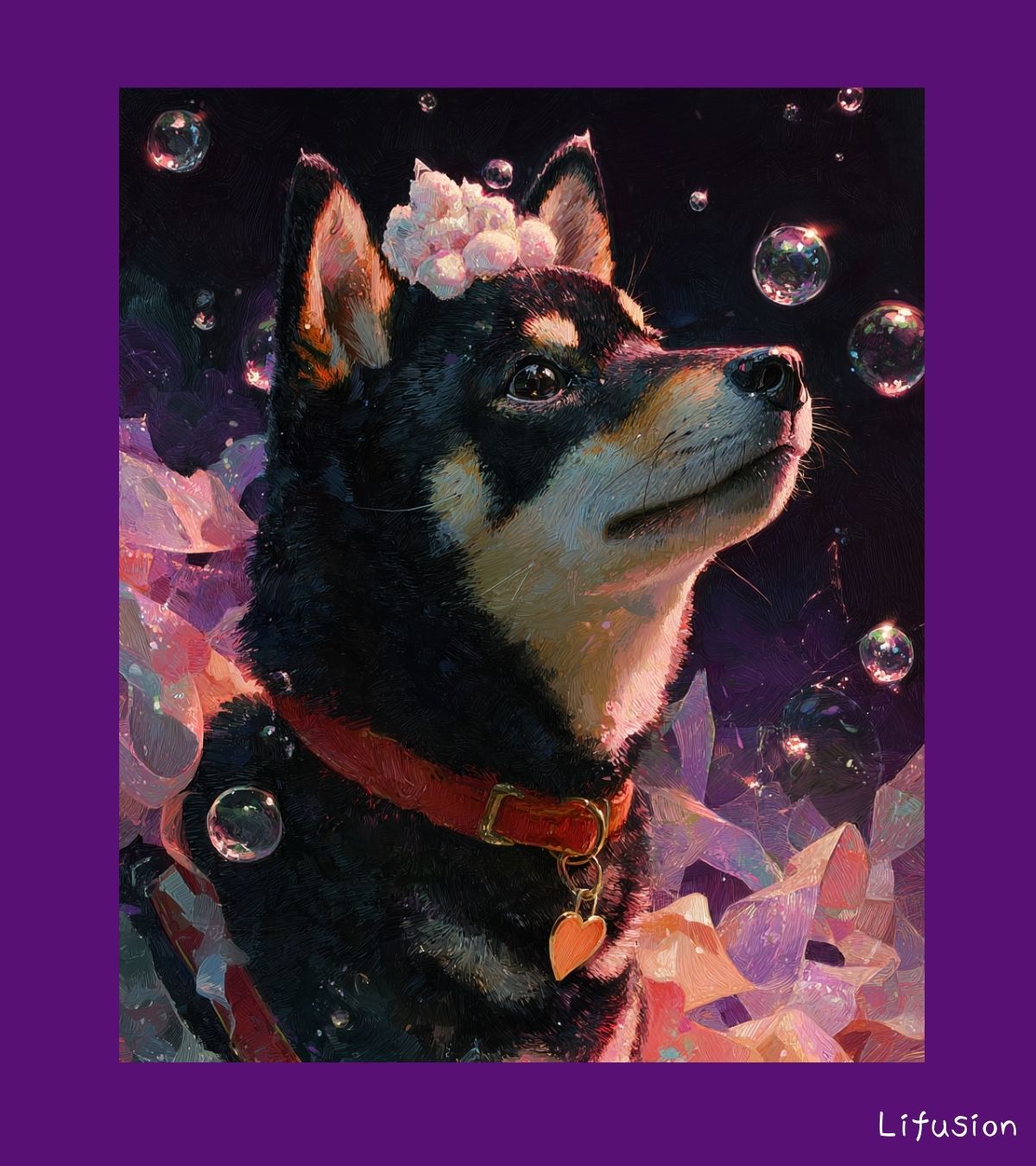 頭にピンクの小花を乗せて、上を見上げている。周りにはクリスタルっぽい花びらとシャボン玉が浮かんでいて、背景は深い紫です。