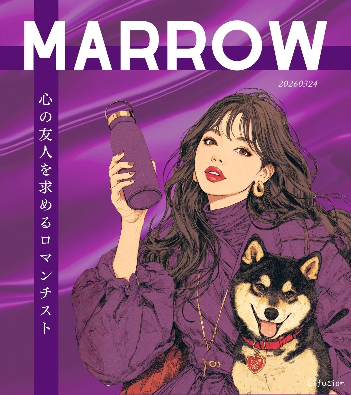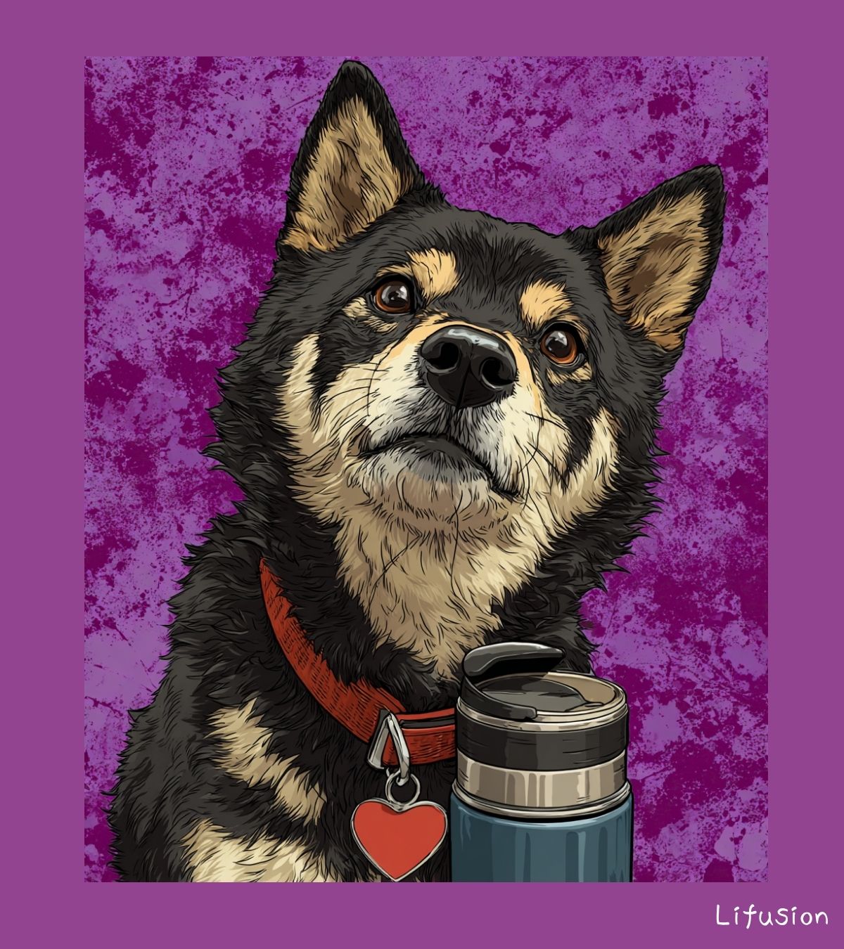 赤い首輪のハートチャームがいつもどおり。横にはタンブラーが1本。マローの飛沫テクスチャの背景に、コミックアート風の太い線が映えてます。琥珀色の瞳がきれいに出ていて、紫の背景との組み合わせが意外と合う。