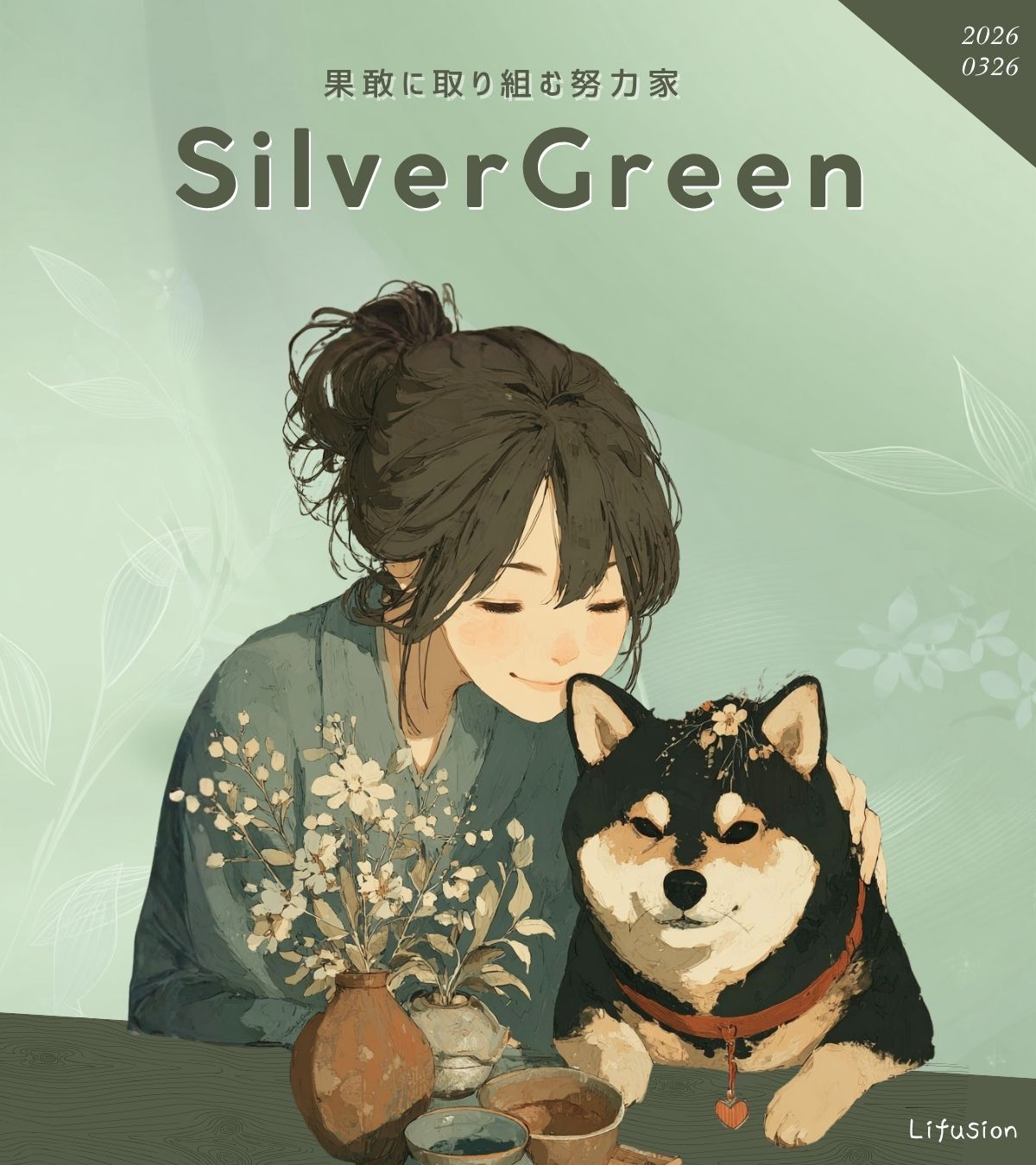 シルバーグリーン×黒柴のAIイラスト