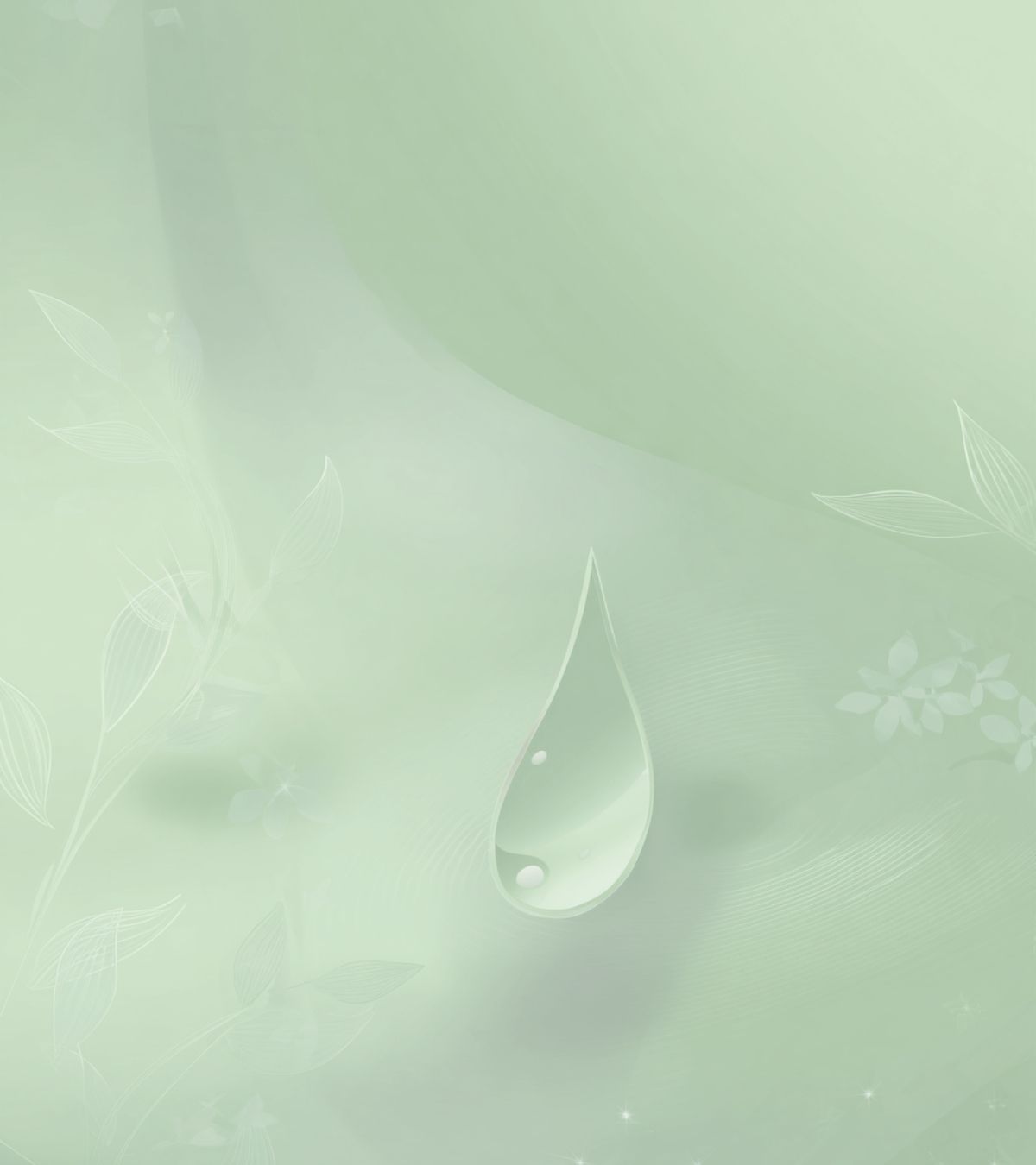 シルバーグリーンのグラデーションに、エッセンシャルオイルの雫モチーフとリーフラインを配した抽象イラストです
