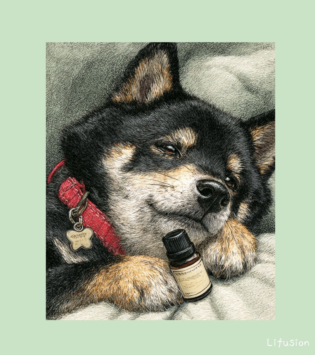赤い首輪に骨型のチャーム。毛の一本一本がペン画の細いストロークで描き込まれていて、もふもふ感がすごい。表情がもう完全に「ひといき中」。この顔を見てたら、こっちまで力が抜けます。