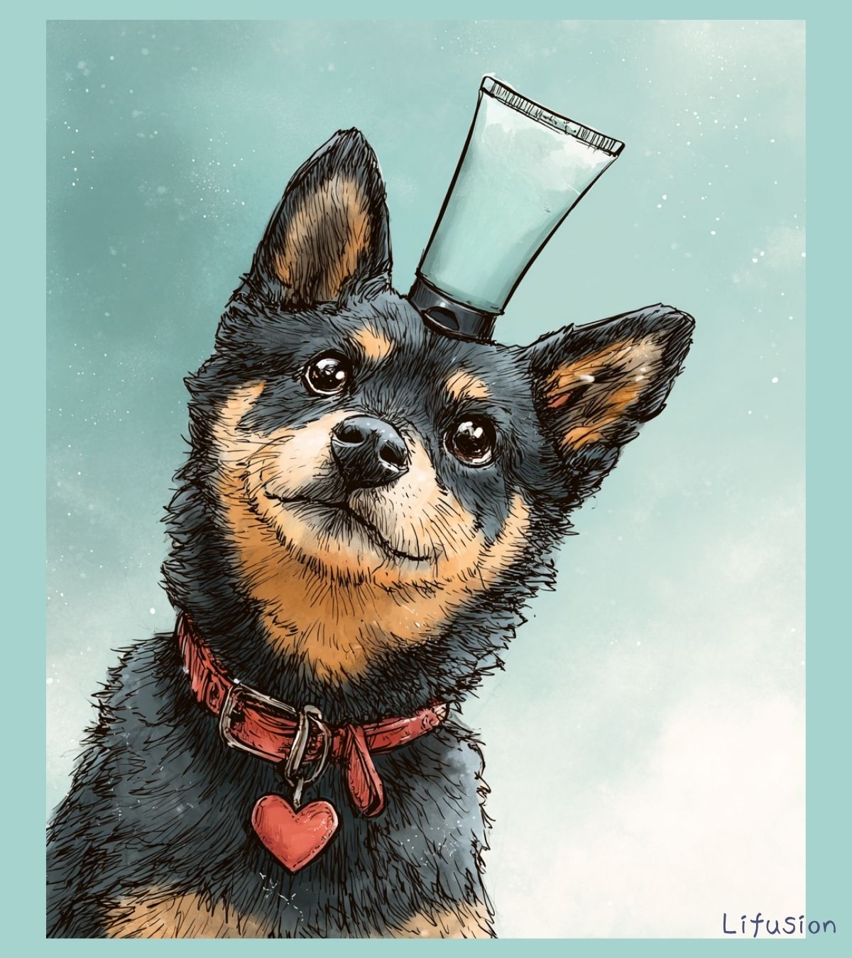 ちょこんとバランスよく乗せているのが、なんとも堂々とした様子です。ハートのタグが揺れた首元も、きちんと描いてもらえました。ペールアクアの背景に黒い毛色がよく映えて、シンプルだけど存在感があります。この色と組み合わせるなら、白や濃紺のような色が引き立てやすいと思います。